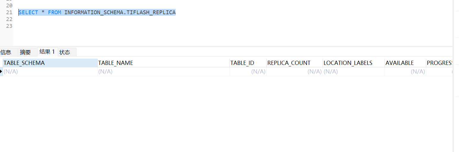 SELECT * FROM INFORMATION_SCHEMA.TIFLASH_REPLICA a WHERE a.TABLE_NAME=‘’;—2022那个表