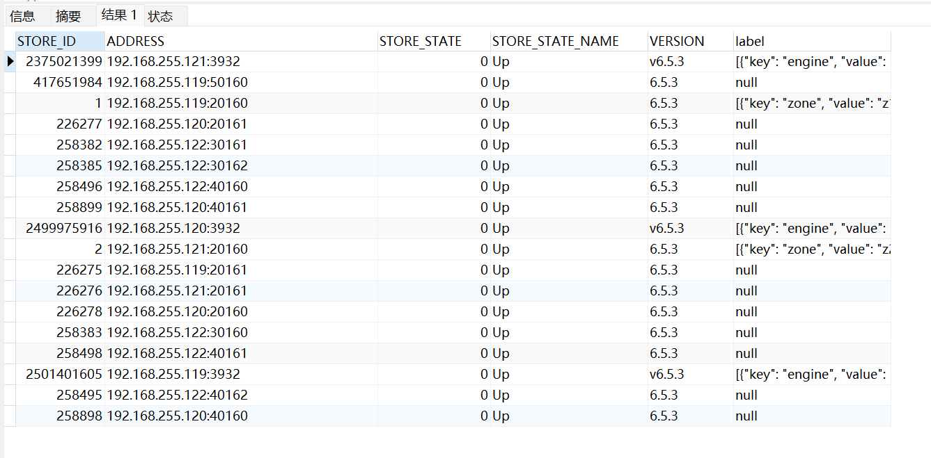192.168.255.119:50160 tikv 192.168.255.119 50160/50180 linux/aarch64 Up /nvme03/tidb/data/tikv-50160 /deploy/tidb/tikv-50160