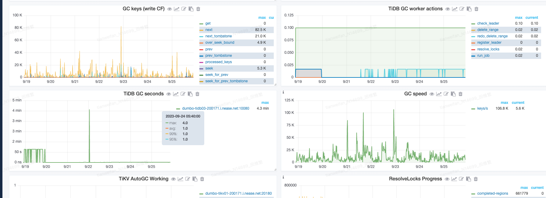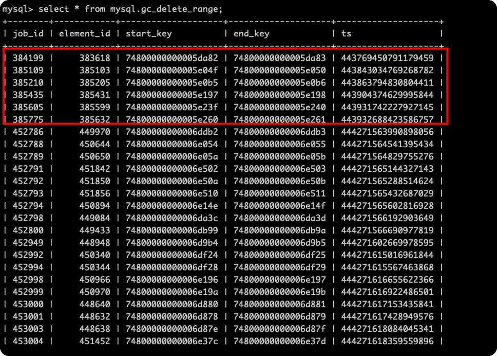 mysql.gc_delete_range 这个表里面,从 0908 就开始长期残留几个 ranges 了,对比其他新的 ranges 差异明显,