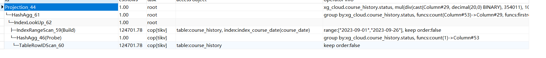 desc SELECT status,(count()/(SELECT count() from course_history where course_date >= ‘2023-09-01’ and course_date <= ‘2023-09-27’))*100 as percent from course_history