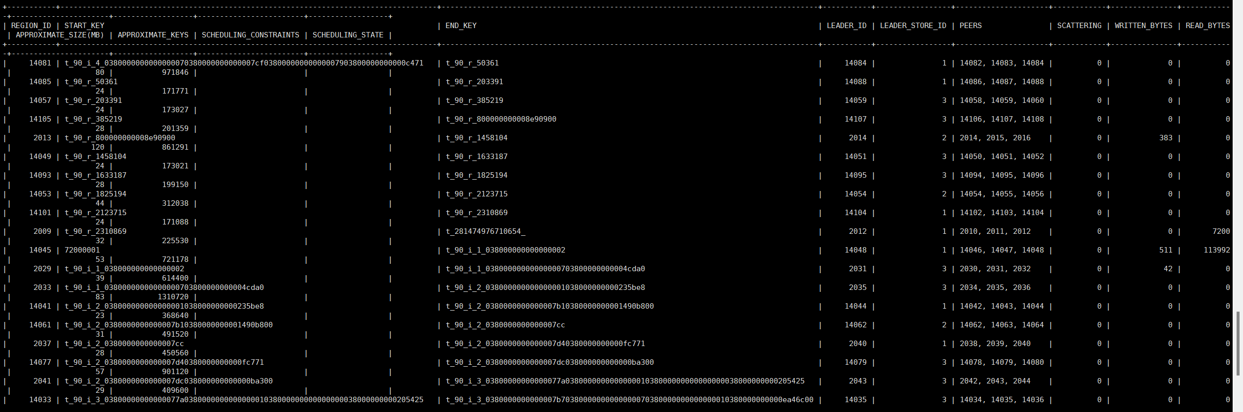 | REGION_ID | START_KEY | END_KEY | LEADER_ID | LEADER_STORE_ID | PEERS | SCATTERING | WRITTEN_BYTES | READ_BYTES | APPROXIMATE_SIZE(MB) | APPROXIMATE_KEYS | SCHEDULING_CONSTRAINTS | SCHEDULING_STATE |