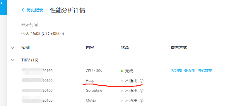 当进入高级调试->实力性能分析->手动分析,选择tikv,勾选heap的时候,再查看结果的时候会出现不适用。如下图