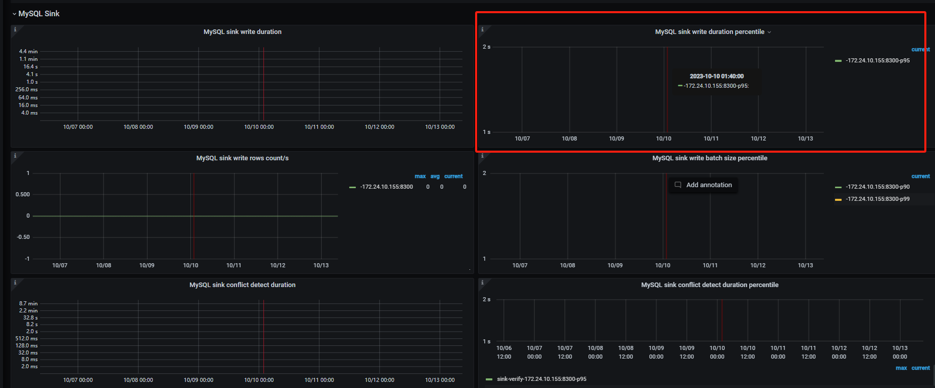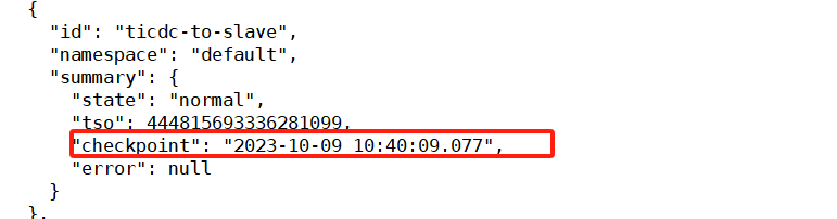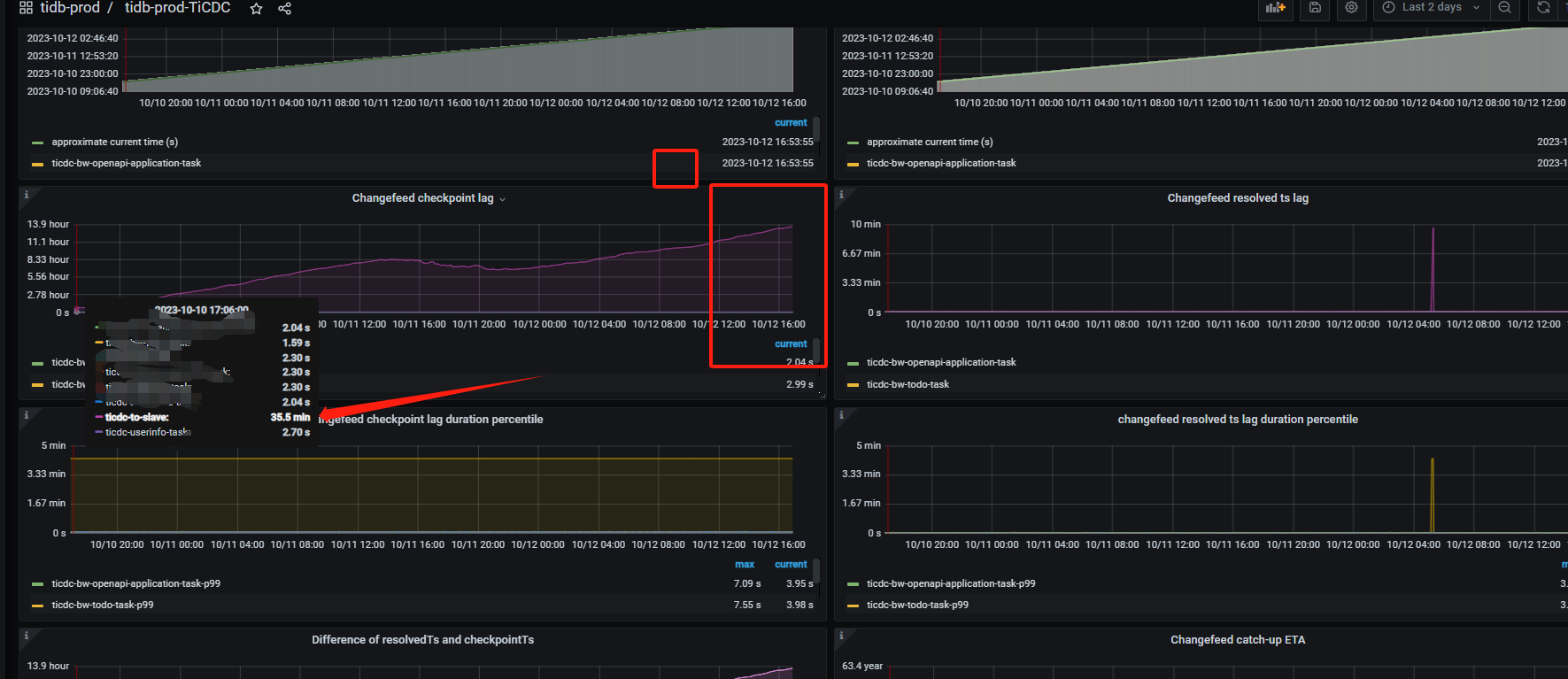 状态都是normal,tso推进的特别慢,,如下图是使用默认tso创建任务后的changefeed监控截图,显示延迟时间是刚创建完任务不久,后边红框是最新的延迟已经14个小时了,从10月10号创建的任务,然后延迟就一直增长