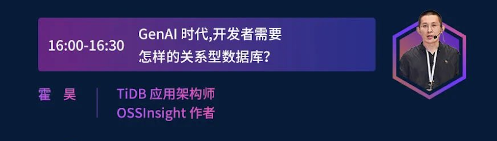 TiDB 应用架构师、OSSInsight 作者 霍昊老师将在 16:00-16:30 带来分享,欢迎成都的 TiDB 社区小伙伴前来捧场、交流! ![]()