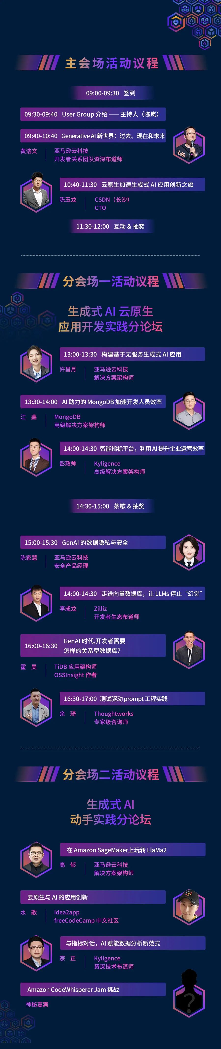 还包括了两个分会场,生成式 AI 云原生应用开发实践分论坛、生成式 AI 动手实践,同时我们还在活动现场设置了互动展区及精美周边奖品打卡,更有惊喜神秘大奖等着你,还在等什么,快来报名参与吧!
