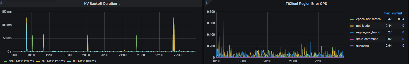 排查了网络问题,网络没有明显的异常;TiDB Server也没有重启或其他的,tidb通过consul做了负载均衡,但是在这个时间段,两个tidb server的日志中,都出现了上述的ERROR日志
