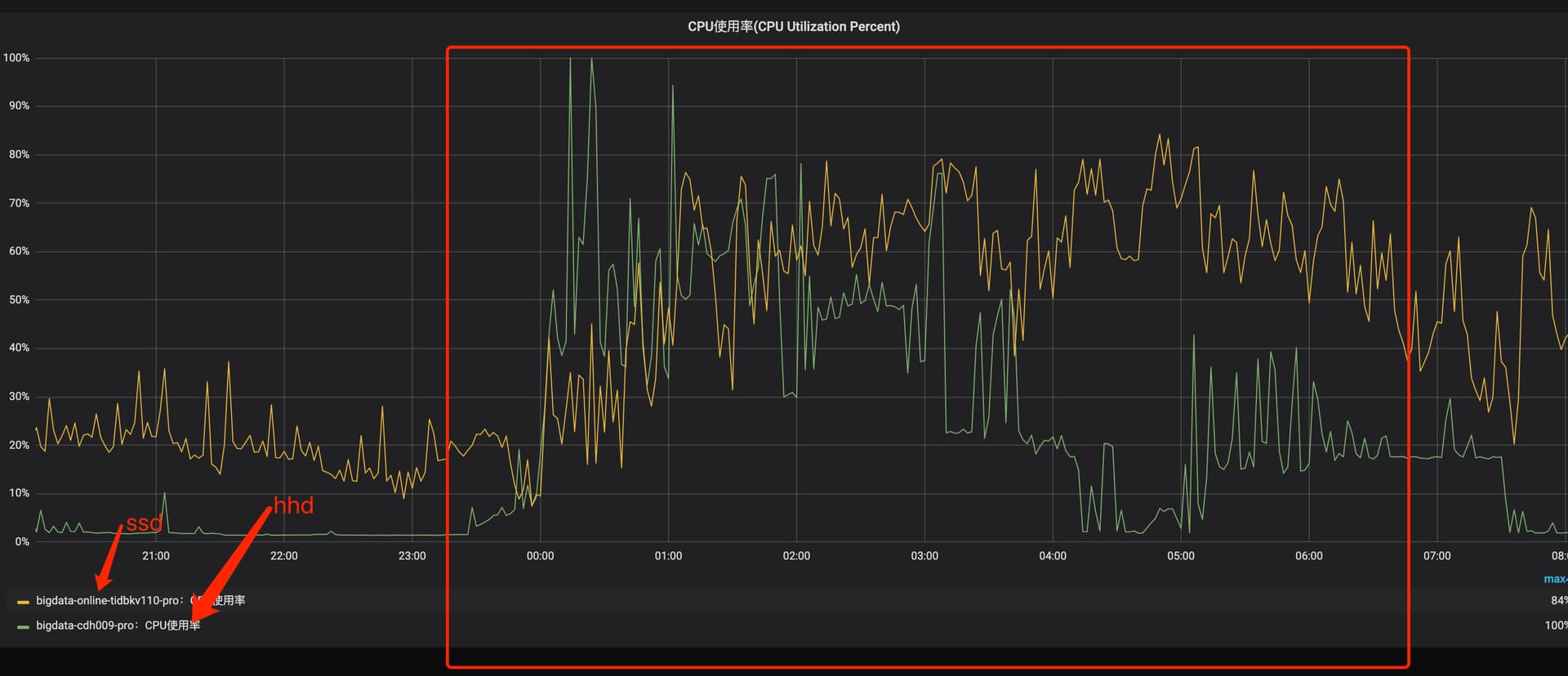 影响配置一小时观察会有数据写入hhd磁盘中(不应该会有数据写入),lable为hhd的磁盘机器CPU拉的很高,实时离线写入很慢,