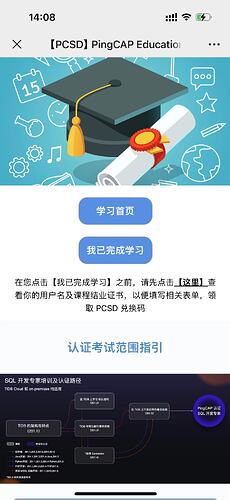 第四步:我们将在学习成果提交后的两个工作日内,通过 TiDB Club 服务号消息向您发送 PCTA 认证考试兑换码