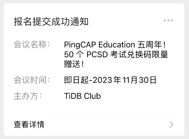 第二步:在 TiDB Club 服务号上会收到报名成功提示,点击【查看详情】