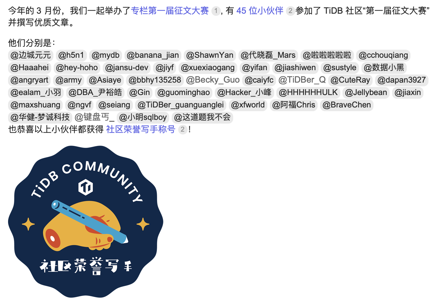 TiDB 社区荣誉版主:版主任职满1年后退役则享有该称号。