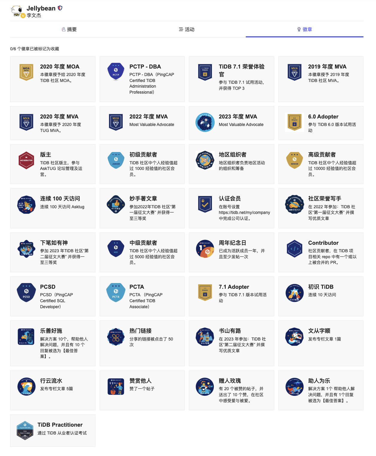 加入 TiDB 社区的这四年中,文杰老师共帮助社区小伙伴们回复了 508 次,发布了 9 篇技术文章,帮助 42 位社区用户解决了技术问题,并获得了 33 枚徽章!