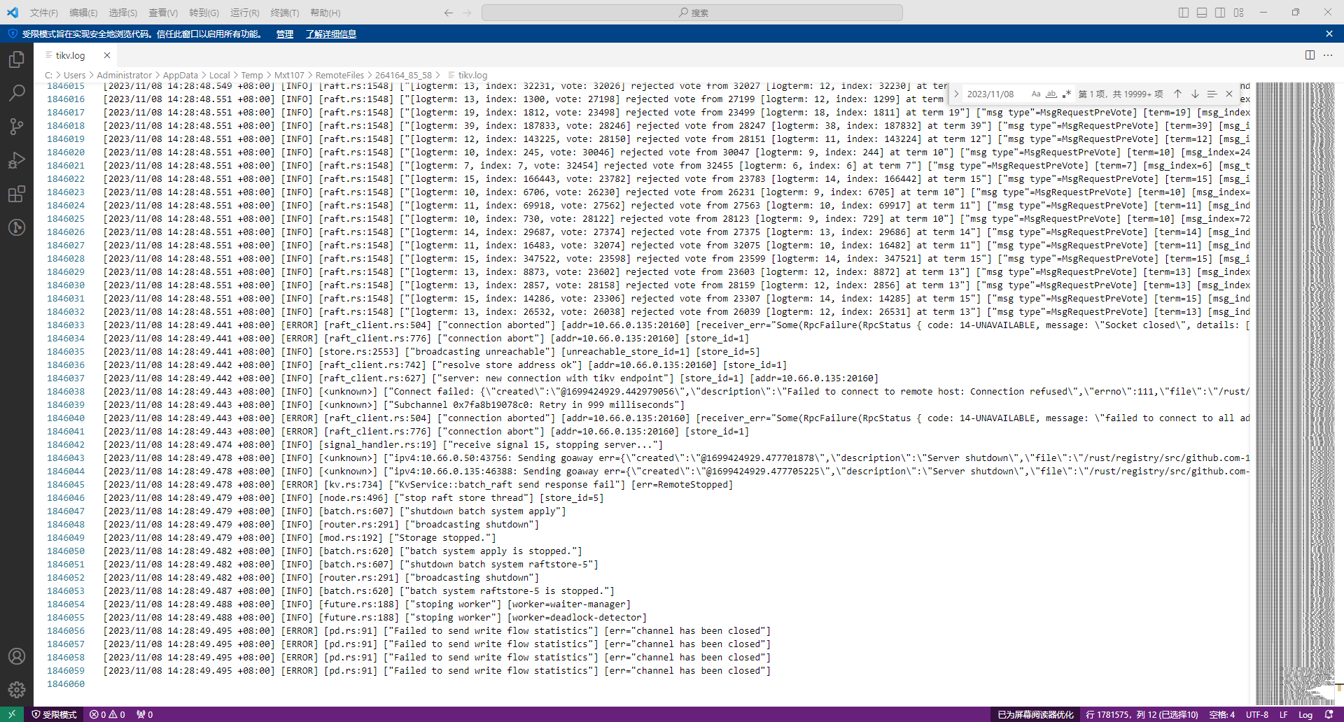 [2023/11/08 20:38:19.732 +08:00] [INFO] [util.rs:544] ["connecting to PD endpoint"] [endpoints=10.66.0.135:2379]