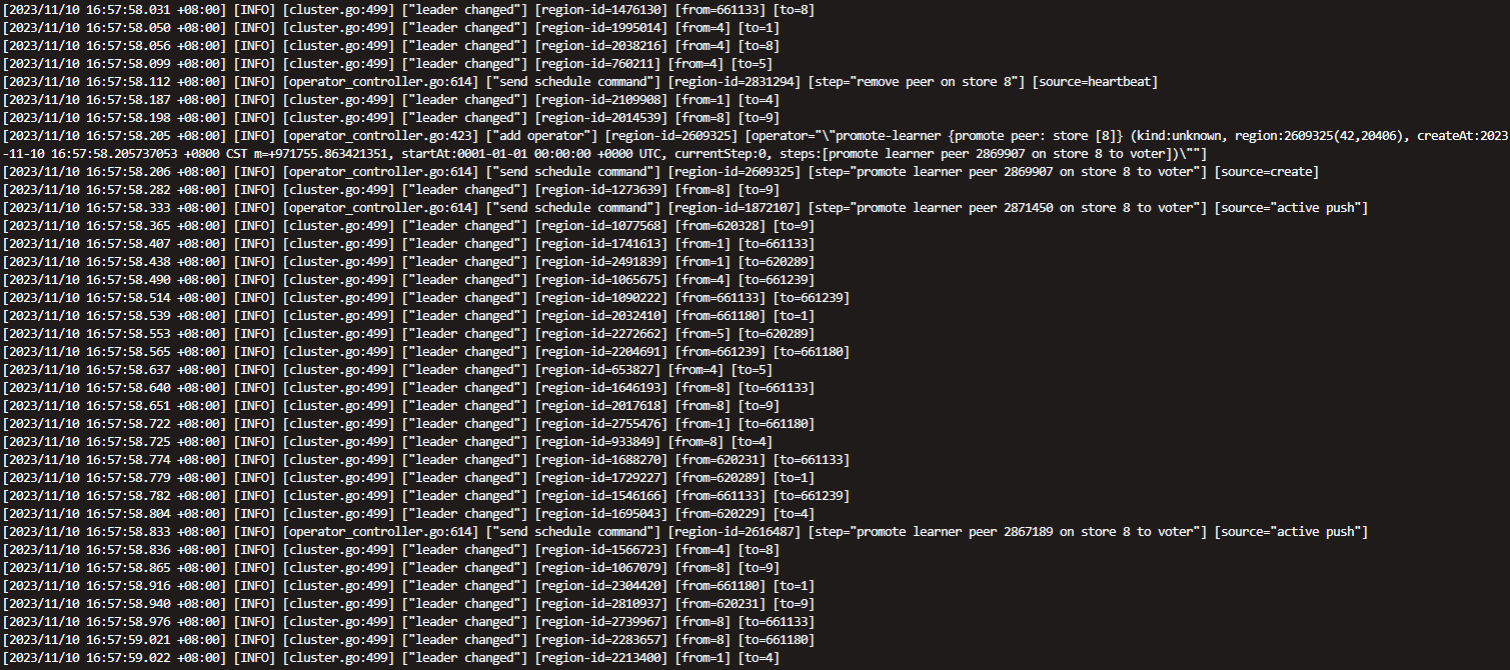 另外,关于 PD 的 leader changed 和 operator timeout 的日志,这可能是由于 PD 集群的负载过重或网络问题导致的。您可以检查 PD 节点的资源使用情况和网络连接情况,确保 PD 集群正常运行。