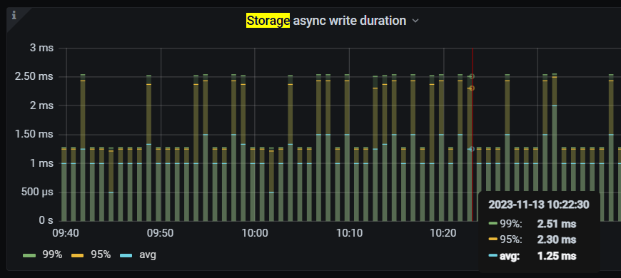 这张图是storage async write duration,包含了所有raft store pool 和apply pool两个阶段的耗时,看图上,最大的也就是2.5ms。并没有超过1.5s的。有点蒙圈了