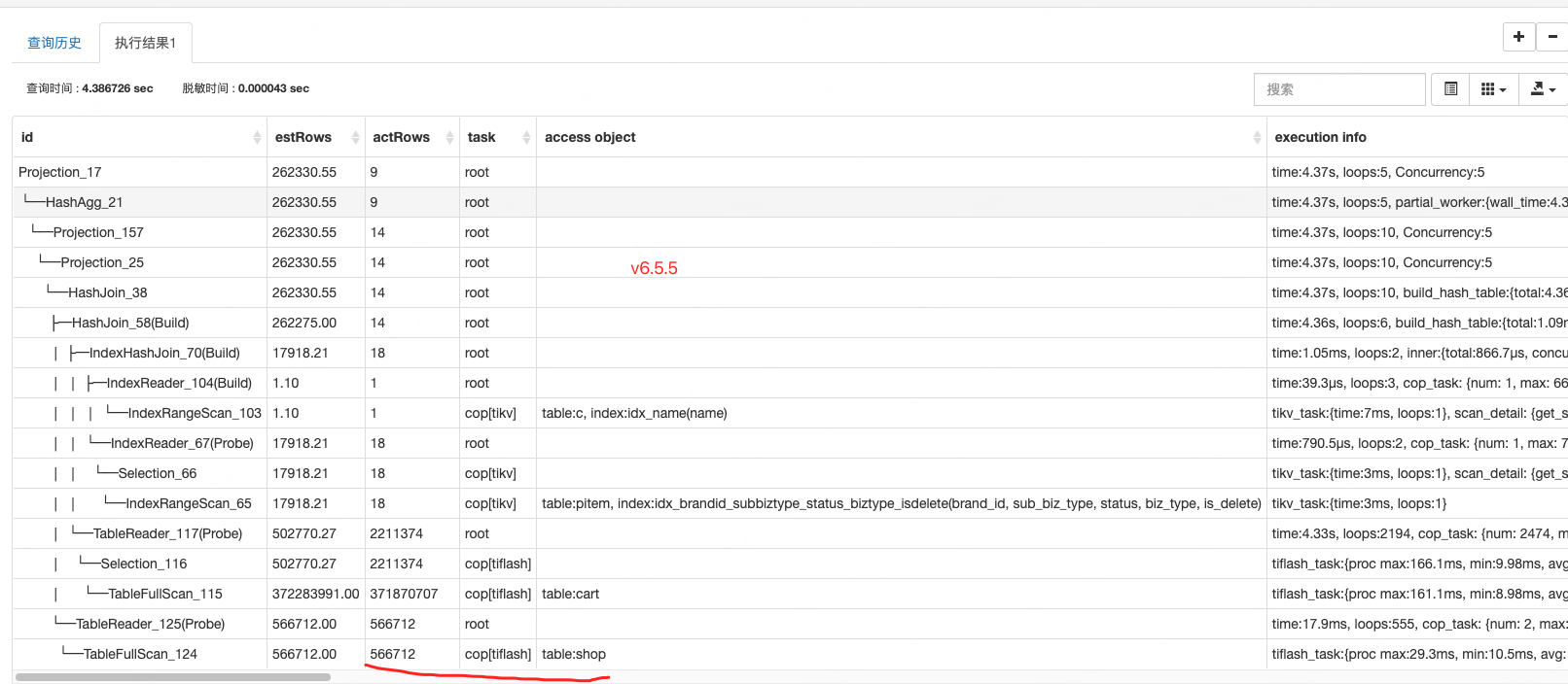 v6执行计划选择走tiflash了,先给这些表做个analyze看看