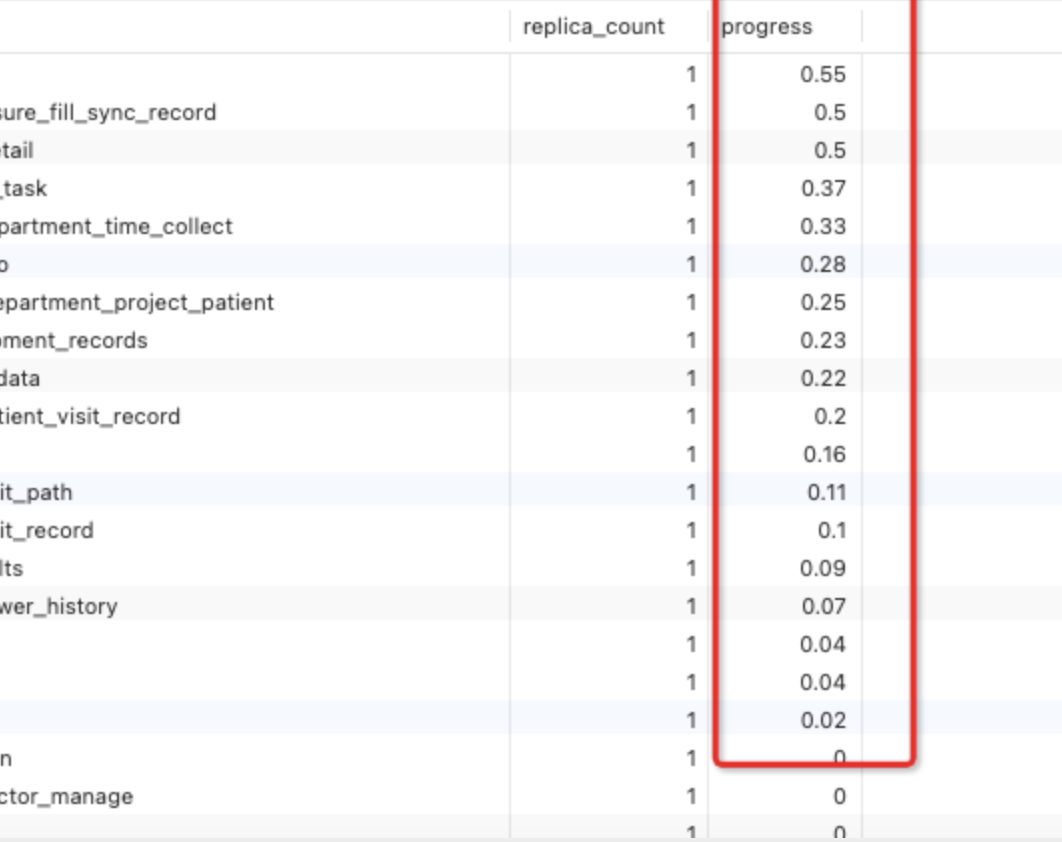 然后使用以下 SQL 查询同步进度。同步了 40 分钟,大约同步了 57 张表后,再次查询进度发现同步卡住,进度不动
