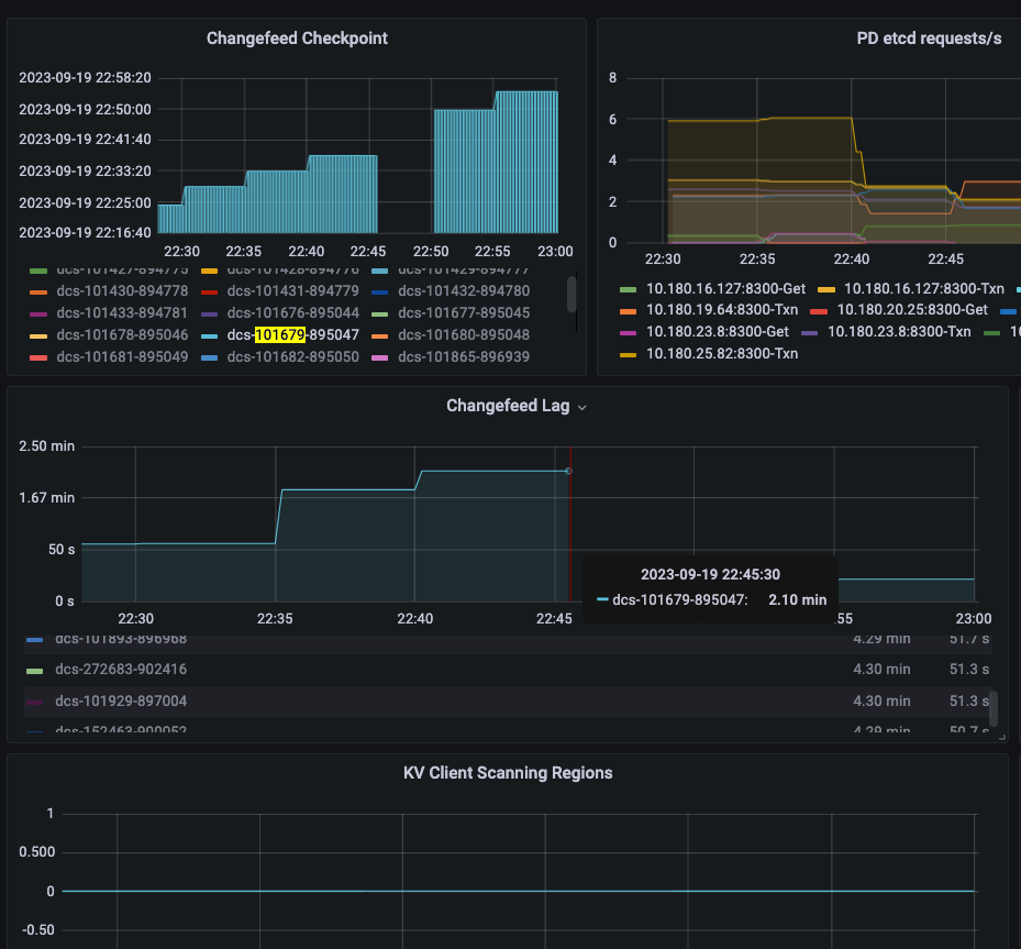 丢数集中在个别几个集群,每次都伴随着对应的changefeed “重启”, 因为metric重置了,伴随着延迟(从几分钟到几小时不等,最后大概率会自动恢复)与大概率的region scanning(下面这个例子就没有观察到region scanning)