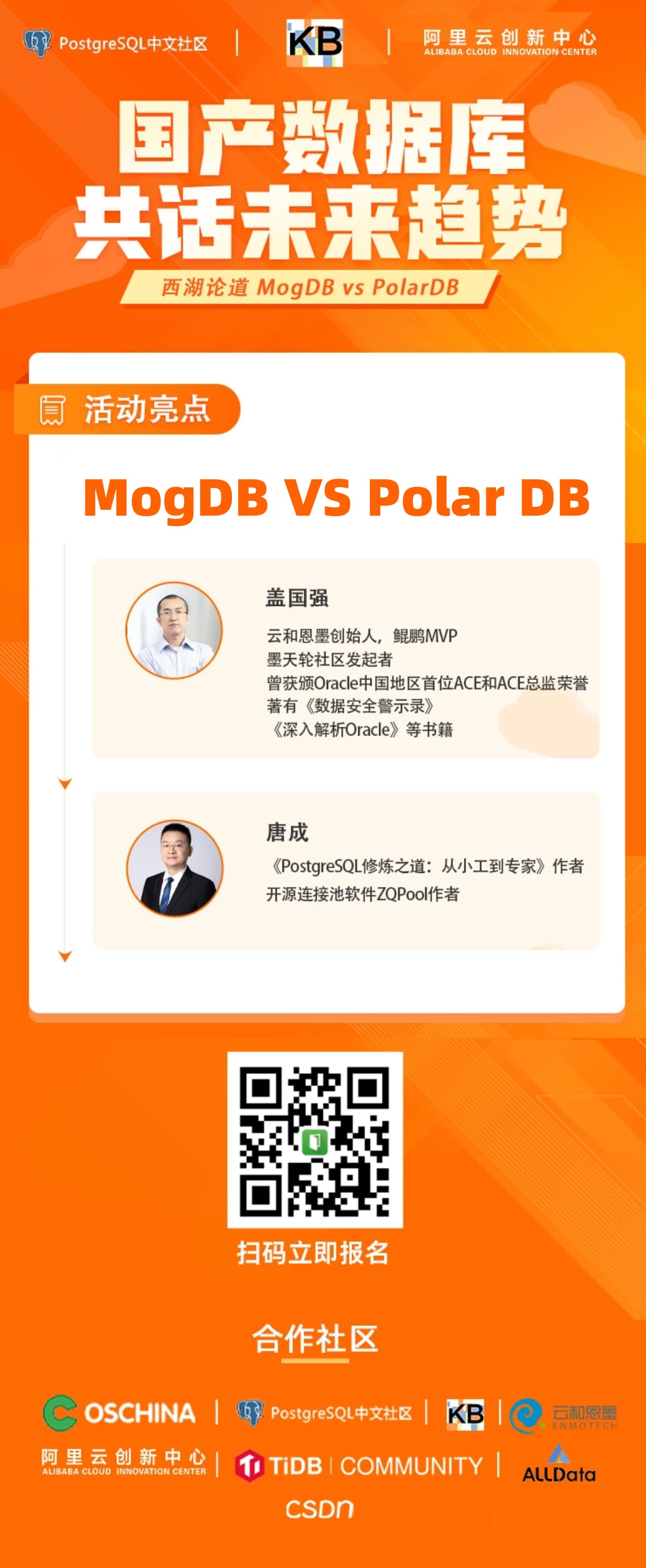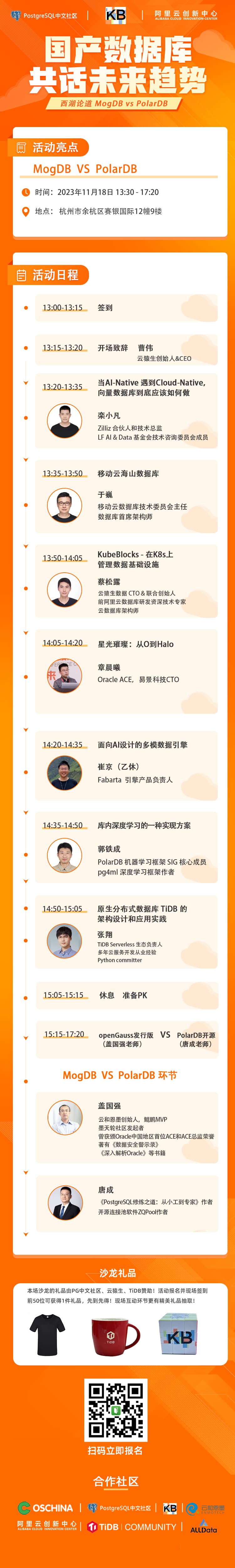 注:本场沙龙的礼品由 PG 中文社区、云猿生、TiDB 赞助,活动报名并现场签到前 50 位可获得 1 件礼品,先到先得哦!现场互动环节更有精美礼品抽取!