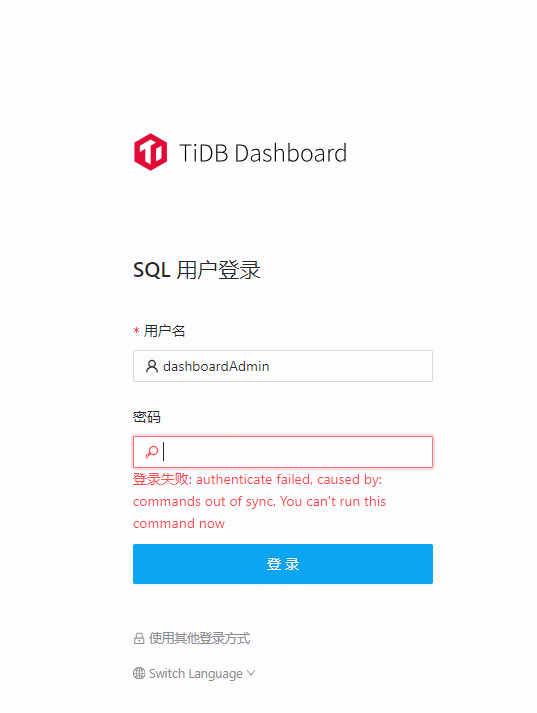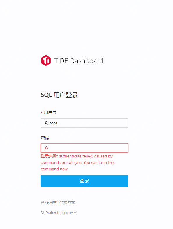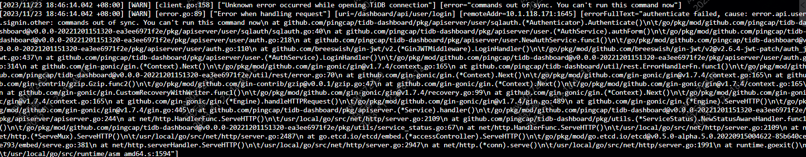 [2023/11/23 18:46:14.042 +08:00] [WARN] [error.go:89] ["Error when handling request"] [uri=/dashboard/api/user/login] [remoteAddr=10.1.118.171:1645] [errorFullText="authenticate failed, cause: error.api.user.signin.other: commands out of sync. You can't run this command now\n at github.com/pingcap/tidb-dashboard/pkg/apiserver/user/sqlauth.(*Authenticator).Authenticate()\n\t/go/pkg/mod/github.com/pingcap/tidb-dashboard@v0.0.0-20221201151320-ea3ee6971f2e/pkg/apiserver/user/sqlauth/sqlauth.go:40\n at github.com/pingcap/tidb-dashboard/pkg/apiserver/user.(*AuthService).authForm()\n\t/go/pkg/mod/github.com/pingcap/tidb-dashboard@v0.0.0-20221201151320-ea3ee6971f2e/pkg/apiserver/user/auth.go:218\n at github.com/pingcap/tidb-dashboard/pkg/apiserver/user.NewAuthService.func1()\n\t/go/pkg/mod/github.com/pingcap/tidb-dashboard@v0.0.0-20221201151320-ea3ee6971f2e/pkg/apiserver/user/auth.go:110\n at github.com/breeswish/gin-jwt/v2.(*GinJWTMiddleware).LoginHandler()\n\t/go/pkg/mod/github.com/breeswish/gin-jwt/v2@v2.6.4-jwt-patch/auth_jwt.go:437\n at github.com/pingcap/tidb-dashboard/pkg/apiserver/user.(*AuthService).LoginHandler()\n\t/go/pkg/mod/github.com/pingcap/tidb-dashboard@v0.0.0-20221201151320-ea3ee6971f2e/pkg/apiserver/user/auth.go:314\n at github.com/gin-gonic/gin.(*Context).Next()\n\t/go/pkg/mod/github.com/gin-gonic/gin@v1.7.4/context.go:165\n at github.com/pingcap/tidb-dashboard/util/rest.ErrorHandlerFn.func1()\n\t/go/pkg/mod/github.com/pingcap/tidb-dashboard@v0.0.0-20221201151320-ea3ee6971f2e/util/rest/error.go:70\n at github.com/gin-gonic/gin.(*Context).Next()\n\t/go/pkg/mod/github.com/gin-gonic/gin@v1.7.4/context.go:165\n at github.com/gin-contrib/gzip.Gzip.func2()\n\t/go/pkg/mod/github.com/gin-contrib/gzip@v0.0.1/gzip.go:47\n at github.com/gin-gonic/gin.(*Context).Next()\n\t/go/pkg/mod/github.com/gin-gonic/gin@v1.7.4/context.go:165\n at github.com/gin-gonic/gin.CustomRecoveryWithWriter.func1()\n\t/go/pkg/mod/github.com/gin-gonic/gin@v1.7.4/recovery.go:99\n at github.com/gin-gonic/gin.(*Context).Next()\n\t/go/pkg/mod/github.com/gin-gonic/gin@v1.7.4/context.go:165\n at github.com/gin-gonic/gin.(*Engine).handleHTTPRequest()\n\t/go/pkg/mod/github.com/gin-gonic/gin@v1.7.4/gin.go:489\n at github.com/gin-gonic/gin.(*Engine).ServeHTTP()\n\t/go/pkg/mod/github.com/gin-gonic/gin@v1.7.4/gin.go:445\n at github.com/pingcap/tidb-dashboard/pkg/apiserver.(*Service).handler()\n\t/go/pkg/mod/github.com/pingcap/tidb-dashboard@v0.0.0-20221201151320-ea3ee6971f2e/pkg/apiserver/apiserver.go:244\n at net/http.HandlerFunc.ServeHTTP()\n\t/usr/local/go/src/net/http/server.go:2109\n at github.com/pingcap/tidb-dashboard/pkg/utils.(*ServiceStatus).NewStatusAwareHandler.func1()\n\t/go/pkg/mod/github.com/pingcap/tidb-dashboard@v0.0.0-20221201151320-ea3ee6971f2e/pkg/utils/service_status.go:67\n at net/http.HandlerFunc.ServeHTTP()\n\t/usr/local/go/src/net/http/server.go:2109\n at net/http.(*ServeMux).ServeHTTP()\n\t/usr/local/go/src/net/http/server.go:2487\n at go.etcd.io/etcd/embed.(*accessController).ServeHTTP()\n\t/go/pkg/mod/go.etcd.io/etcd@v0.5.0-alpha.5.0.20220915004622-85b640cee793/embed/serve.go:381\n at net/http.serverHandler.ServeHTTP()\n\t/usr/local/go/src/net/http/server.go:2947\n at net/http.(*conn).serve()\n\t/usr/local/go/src/net/http/server.go:1991\n at runtime.goexit()\n\t/usr/local/go/src/runtime/asm_amd64.s:1594"]