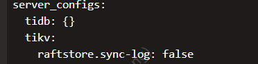 【遇到的问题:问题现象及影响】 用的是ssd磁盘 磁盘长时间IO使用率100% iotop查看是 jbd2/vdb-8占用过高 看文档可以修改sync-log=false 但是网上的文档都是ansible部署的 我是用tiup部署的 不知道在哪儿修改 请大佬指点在哪儿修改sync-log=false