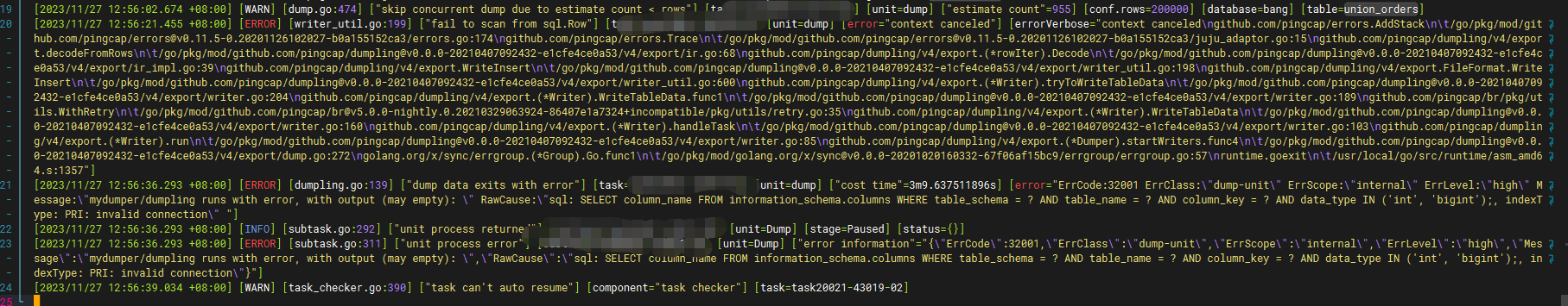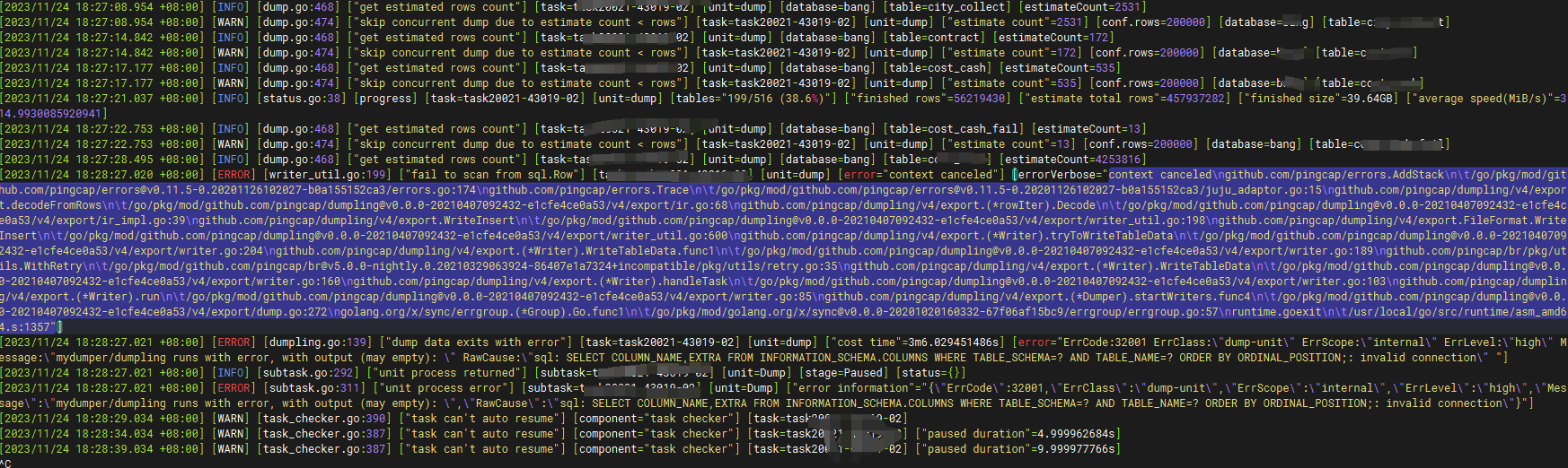 context canceled\ngithub.com/pingcap/errors.AddStack\n\t/go/pkg/mod/github.com/pingcap/errors@v0.11.5-0.20201126102027-b0a155152ca3/errors.go:174\ngithub.com/pingcap/errors.Trace\n\t/go/pkg/mod/github.com/pingcap/errors@v0.11.5-0.20201126102027-b0a155152ca3/juju_adaptor.go:15\ngithub.com/pingcap/dumpling/v4/export.decodeFromRows\n\t/go/pkg/mod/github.com/pingcap/dumpling@v0.0.0-20210407092432-e1cfe4ce0a53/v4/export/ir.go:68\ngithub.com/pingcap/dumpling/v4/export.(*rowIter).Decode\n\t/go/pkg/mod/github.com/pingcap/dumpling@v0.0.0-20210407092432-e1cfe4ce0a53/v4/export/ir_impl.go:39\ngithub.com/pingcap/dumpling/v4/export.WriteInsert\n\t/go/pkg/mod/github.com/pingcap/dumpling@v0.0.0-20210407092432-e1cfe4ce0a53/v4/export/writer_util.go:198\ngithub.com/pingcap/dumpling/v4/export.FileFormat.WriteInsert\n\t/go/pkg/mod/github.com/pingcap/dumpling@v0.0.0-20210407092432-e1cfe4ce0a53/v4/export/writer_util.go:600\ngithub.com/pingcap/dumpling/v4/export.(*Writer).tryToWriteTableData\n\t/go/pkg/mod/github.com/pingcap/dumpling@v0.0.0-20210407092432-e1cfe4ce0a53/v4/export/writer.go:204\ngithub.com/pingcap/dumpling/v4/export.(*Writer).WriteTableData.func1\n\t/go/pkg/mod/github.com/pingcap/dumpling@v0.0.0-20210407092432-e1cfe4ce0a53/v4/export/writer.go:189\ngithub.com/pingcap/br/pkg/utils.WithRetry\n\t/go/pkg/mod/github.com/pingcap/br@v5.0.0-nightly.0.20210329063924-86407e1a7324+incompatible/pkg/utils/retry.go:35\ngithub.com/pingcap/dumpling/v4/export.(*Writer).WriteTableData\n\t/go/pkg/mod/github.com/pingcap/dumpling@v0.0.0-20210407092432-e1cfe4ce0a53/v4/export/writer.go:160\ngithub.com/pingcap/dumpling/v4/export.(*Writer).handleTask\n\t/go/pkg/mod/github.com/pingcap/dumpling@v0.0.0-20210407092432-e1cfe4ce0a53/v4/export/writer.go:103\ngithub.com/pingcap/dumpling/v4/export.(*Writer).run\n\t/go/pkg/mod/github.com/pingcap/dumpling@v0.0.0-20210407092432-e1cfe4ce0a53/v4/export/writer.go:85\ngithub.com/pingcap/dumpling/v4/export.(*Dumper).startWriters.func4\n\t/go/pkg/mod/github.com/pingcap/dumpling@v0.0.0-20210407092432-e1cfe4ce0a53/v4/export/dump.go:272\ngolang.org/x/sync/errgroup.(*Group).Go.func1\n\t/go/pkg/mod/golang.org/x/sync@v0.0.0-20201020160332-67f06af15bc9/errgroup/errgroup.go:57\nruntime.goexit\n\t/usr/local/go/src/runtime/asm_amd64.s:1357"