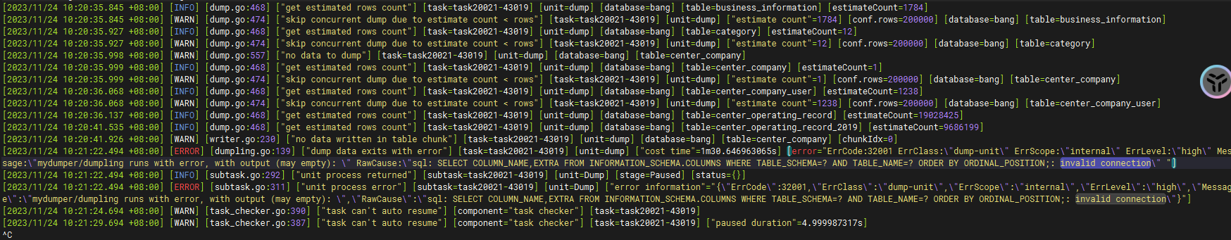“Message”: "mydumper/dumpling runs with error, with output (may empty): ",