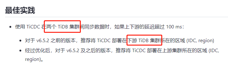 - 对于 v6.5.2 之前的版本,推荐将 TiCDC 部署在下游 TiDB 集群所在的区域 (IDC, region)