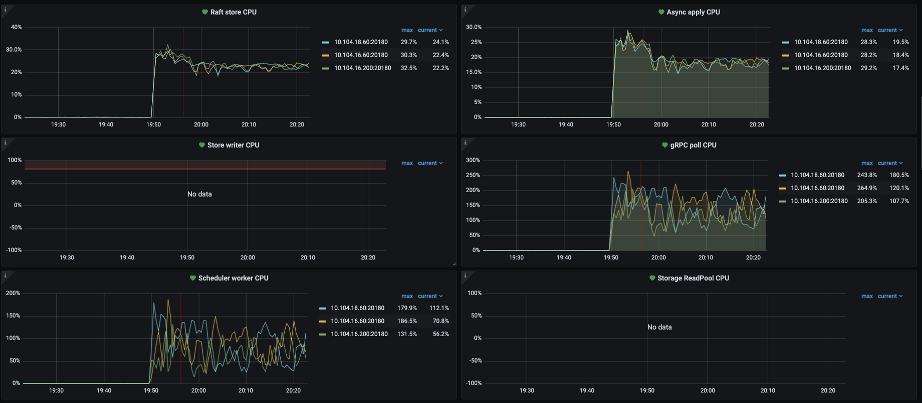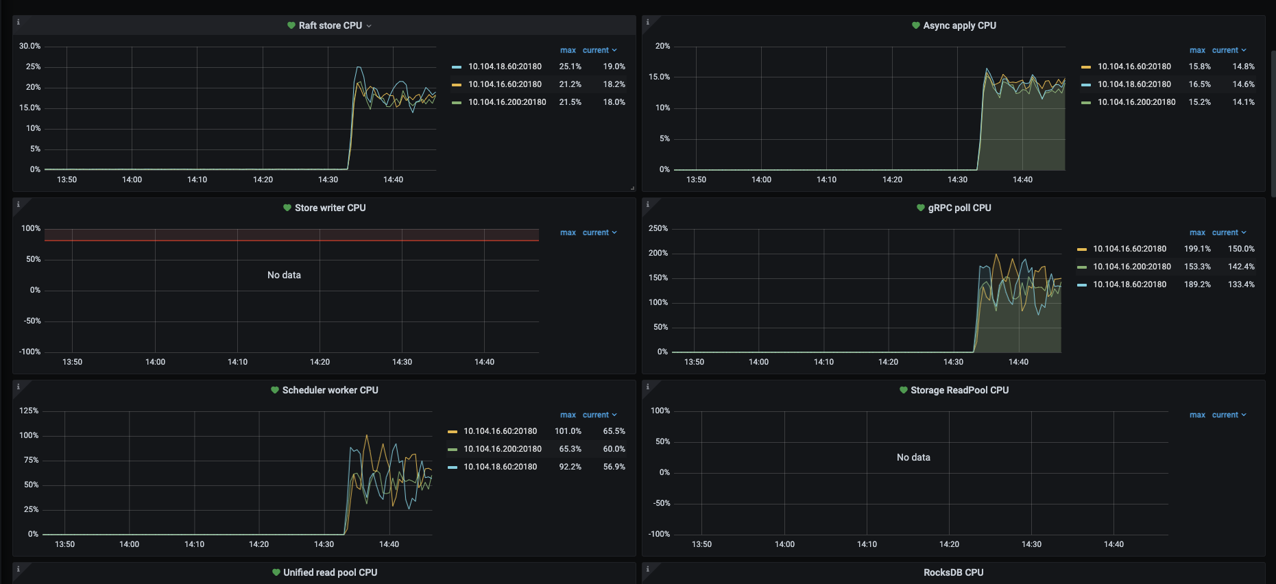 从目前的TiKV-Details Thread CPU监控图来看,所有的内部线程数使用率都没有达到设置的瓶颈