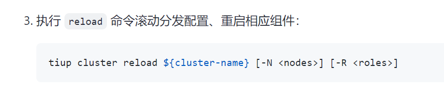 - 如果不想重启整个集群,可以在reload时添加 -R pd,tikv 来限制只重启pd和tikv节点。