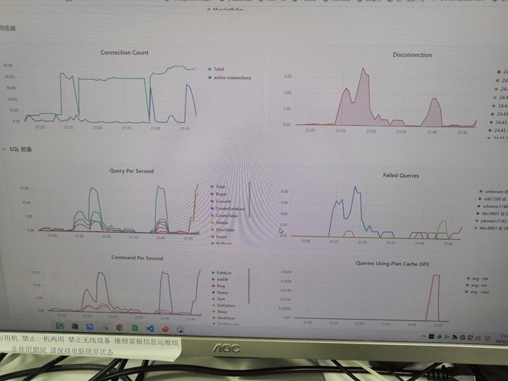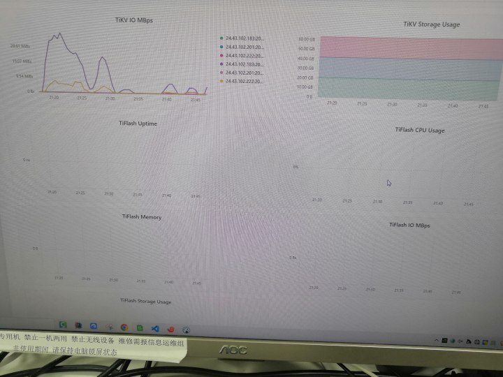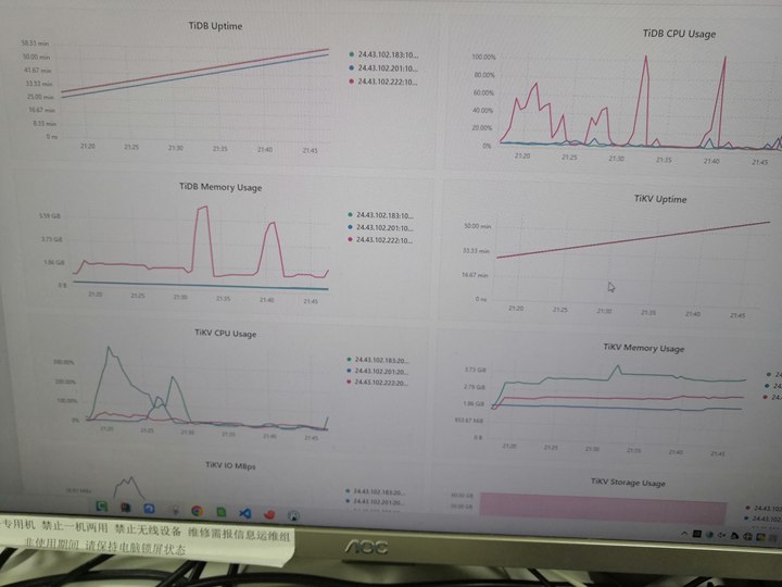 【资源配置】三个服务器,8核32G512G(ip:183),16核64G2T(ip:222),16核64G2T(ip:201),磁盘为XFS,写入速度可达万转,均是千兆网卡内网部署,每个节点分别部署了db,pd,kv,201作为总控制部署了监控服务,并且当前是尝试阶段,在201上部署了dm实时增量同步222中的mysql数据