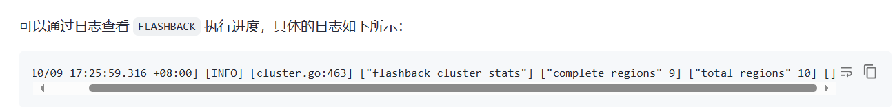 【遇到的问题:问题现象及影响】执行 FLASHBACK CLUSTER TO TIMESTAMP 命令后,如何确认flaskback的进度,类似百分之多少?当前去查tikv的日志,能获取到日志如