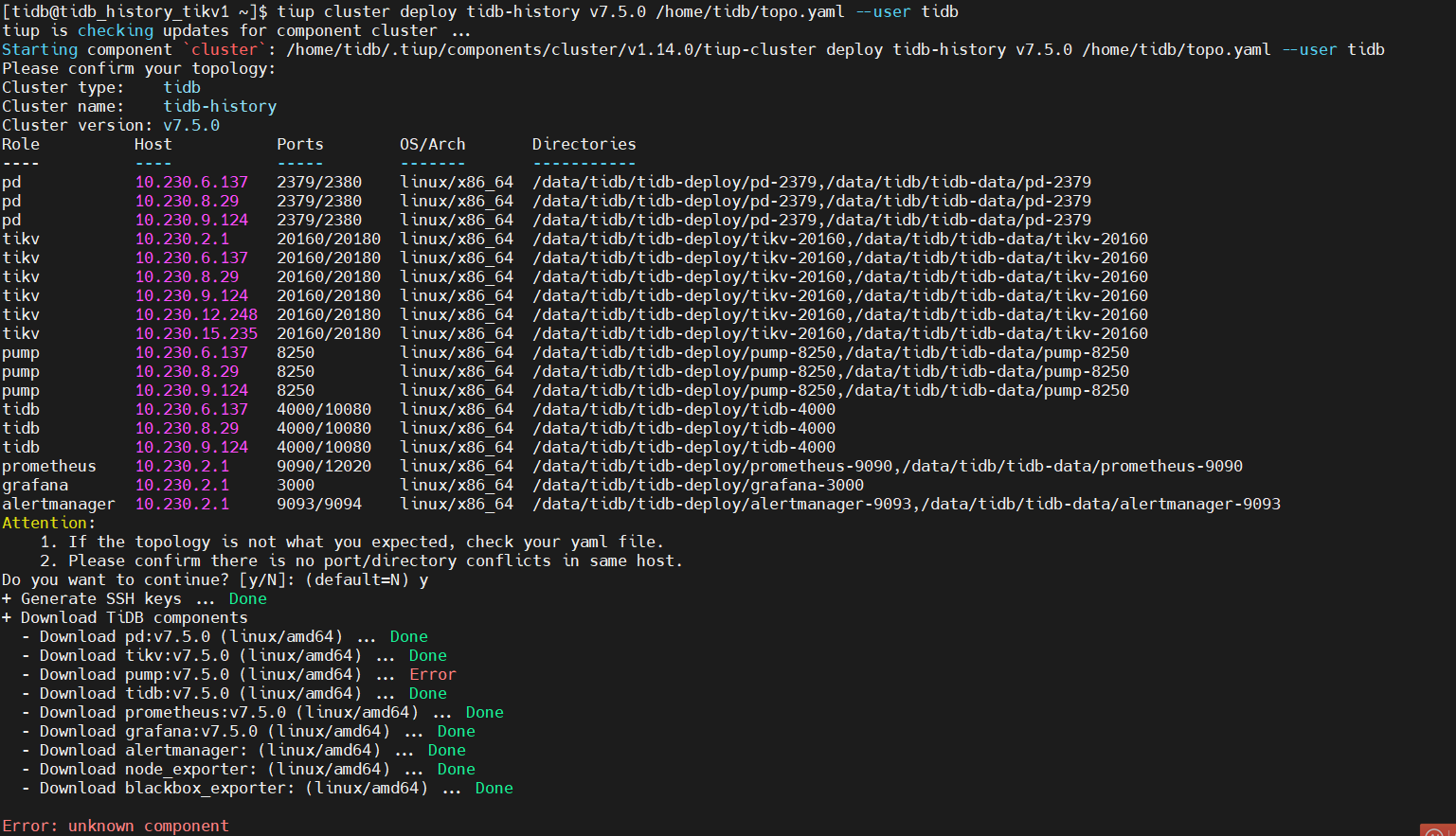 【复现路径】安装tidb集群7.5.0时,全局配置文件中配置了pump组件,检测时能通过,安装时提时pump组件为未知组件