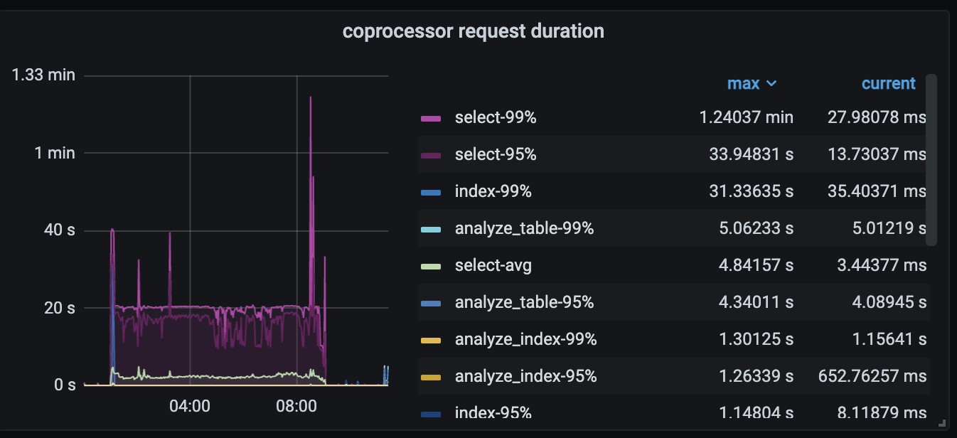 SQL语句已经确认过执行计划是有走索引的。工作时间执行就很快返回,但是在凌晨跑任务的时候就会卡很久。analyze table 已经在 1213 执行过,也在 1213 的时候 reload 了 tikv ,看看 1214 凌晨有无效果。