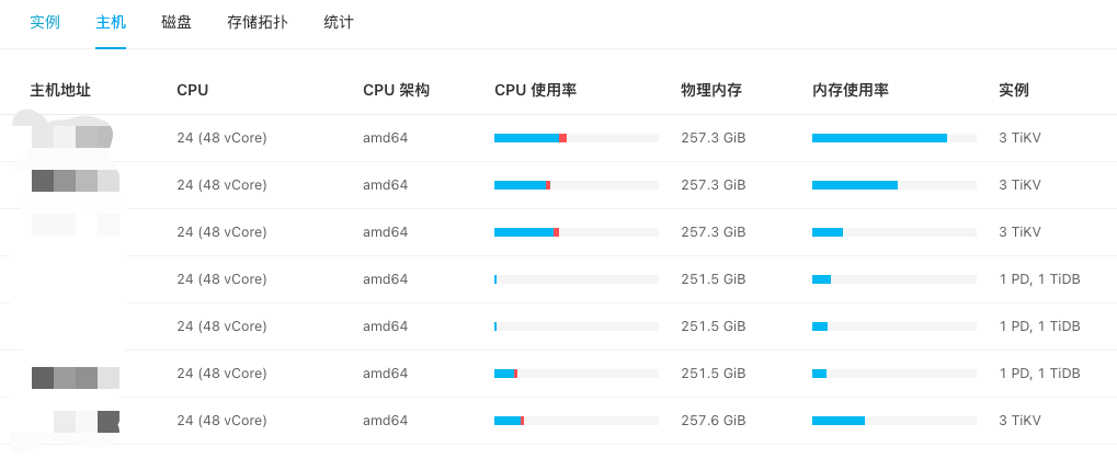 【资源配置】进入到 TiDB Dashboard -集群信息 (Cluster Info) -主机(Hosts) 截图此页面