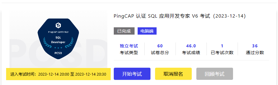 刚考完,考了 SEQUENCES、时区、枚举字段、事务、预处理语句、sql_mode、tikv下推等,有些难,有一部分学习视频里没有的内容