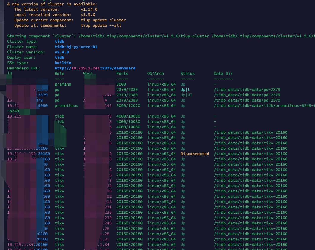 业务突然报障,说tidb集群不可用,上去tiup display 发现有一个kv节点disconnect ,然后重启这个节点也还是disconnt,10分后恢复。