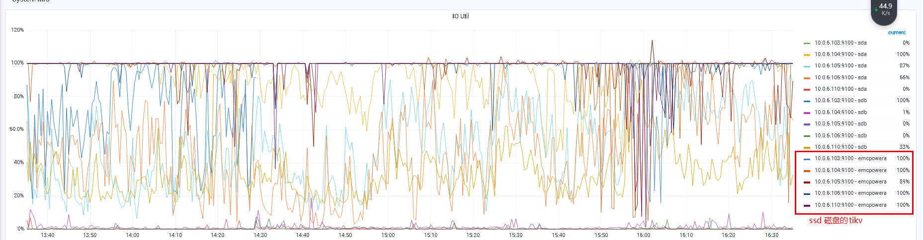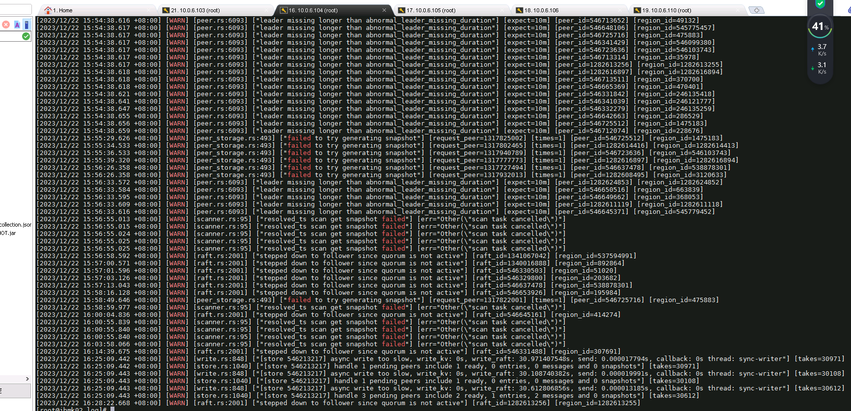 集群5台服务器 ,每台服务器部署3个tikv, 其中两个tikv在机械盘, 1个tikv在ssd盘, TIKV节点共15个 。12月15号 6点~7点之间缩减了一个 机械盘的tikv, 因为内存问题, 17号早上8点20分到 30分之间 再次缩减一个 机械盘的tikv , 然后监控查看, 从17号开始, 5台服务器的 ssd 磁盘io一直占满100%。 查看日志ssd磁盘上的tikv , 有大量的 [“failed to send extra message”] 报错 及 大量的region 找不到leader , 但是根据region id ,可以查看 leader、 还有大量的info 信息 报频繁选举 [“starting a new election”] 。 解决方法:停掉业务应用, 重启tidb 集群没有解决 io 100%问题。
