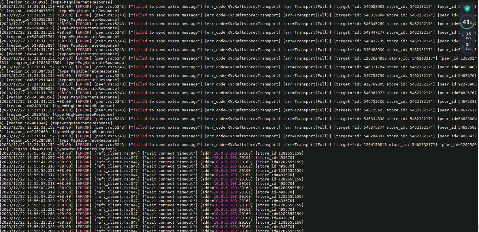 【遇到的问题:问题现象及影响】 : 查看日志ssd磁盘上的tikv , 有大量的 [“failed to send extra message”] 报错 及 大量的region 找不到leader , 但是根据region id ,可以查看 leader、 还有大量的info 信息 报频繁选举 [“starting a new election”] 。 解决方法:停掉业务应用, 重启tidb 集群没有解决 io 100%问题。