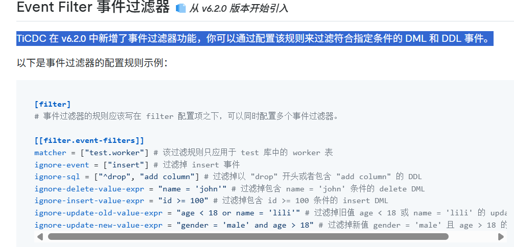 TiCDC 在 v6.2.0 中新增了事件过滤器功能,可以通过配置该规则来过滤符合指定条件的 DML 和 DDL 事件。 这个ignore-delete-value-expr 官方提到了这种事件过滤