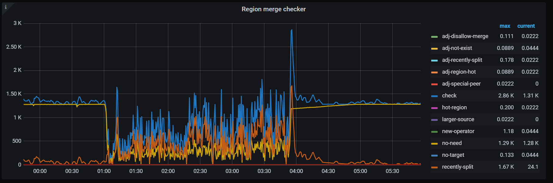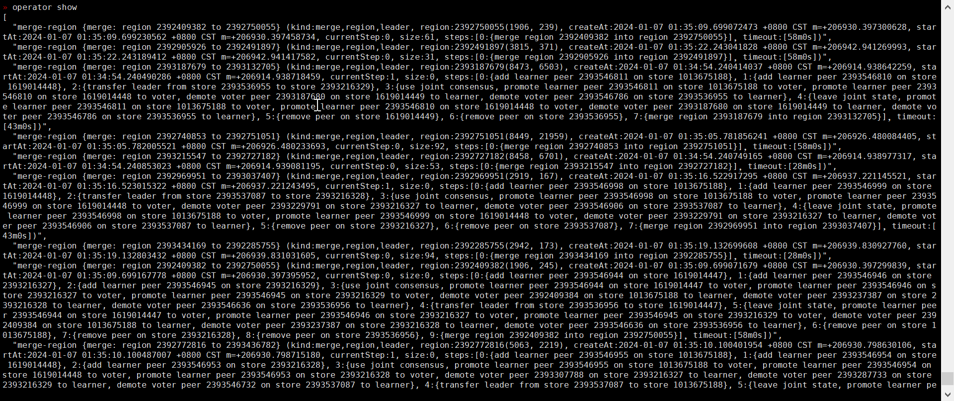 【遇到的问题:问题现象及影响】通过pd-ctl中的operator show发现总是一堆merge-region任务,balance-region反而很少,扩容在夜间低峰运行,扩容前operator show基本为空。