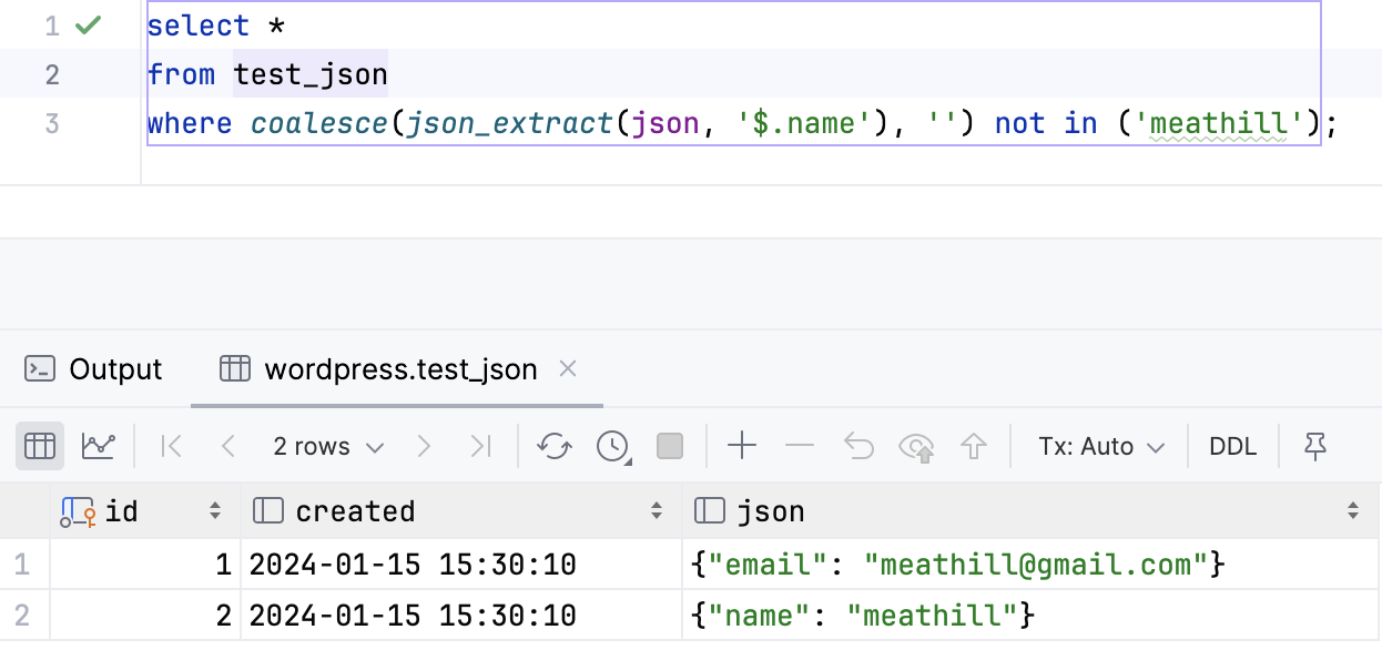 MySQL [test]> select json_extract(info,'$.name'),coalesce(json_extract(info,'$.name'),''),info from t5 where coalesce(json_extract(info,'$.name'),'') not in ('Barney');