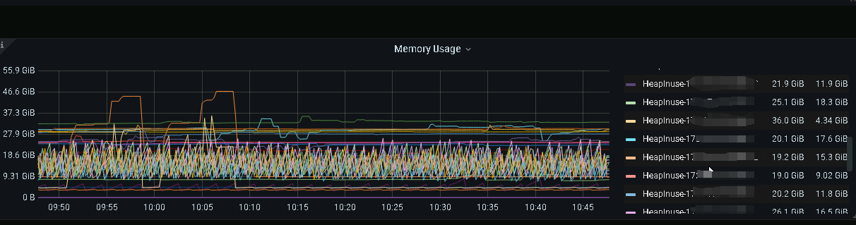 监控显示主要内存分为heap memory , process ,analyze 占用的大小,其中heap memory ,process占用比较多,实际内存占用,是看heap memory 还是process,这里process ,和heap 都使用20-30G,如何分析占用这么多内存是否合理