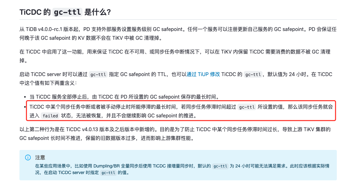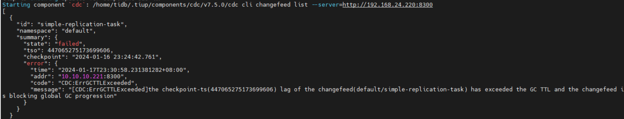 “message”: "[CDC:ErrGCTTLExceeded]the checkpoint-ts(447065275173699606) lag of the changefeed(default/simple-replication-task) has exceeded the GC TTL and the changefeed is blocking global GC progression
