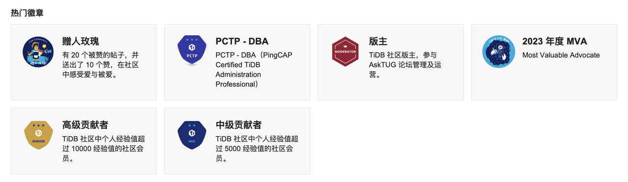 TiDB 社区荣誉版主:版主任职满1年后退役则享有该称号。