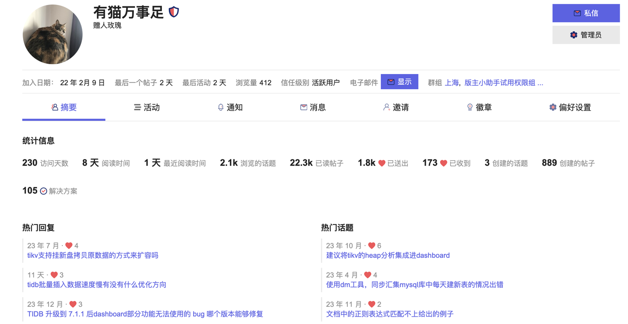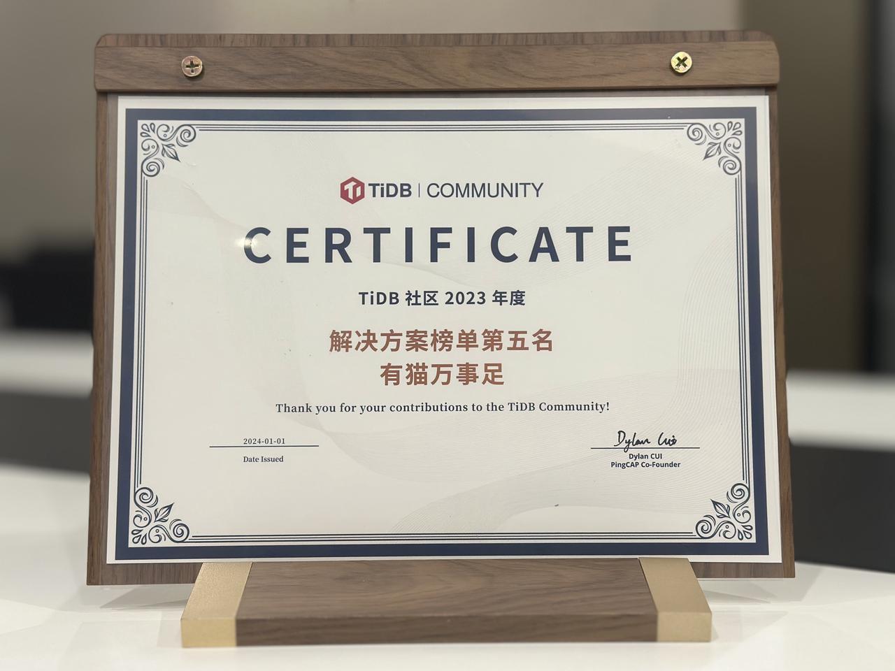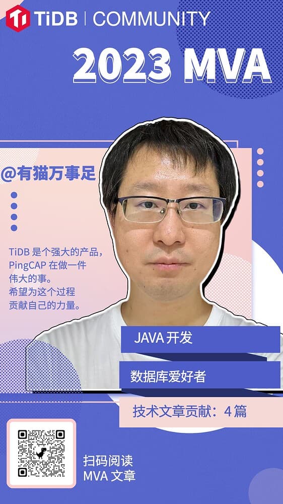 有猫万事足|TiDB 社区版主、TiDB 社区 2023 年度 MVA、TiDB 社区 2023 年度解决方案榜单第五名获得者、TiDB 社区 2023 七夕为爱挑战赛第五名获得者