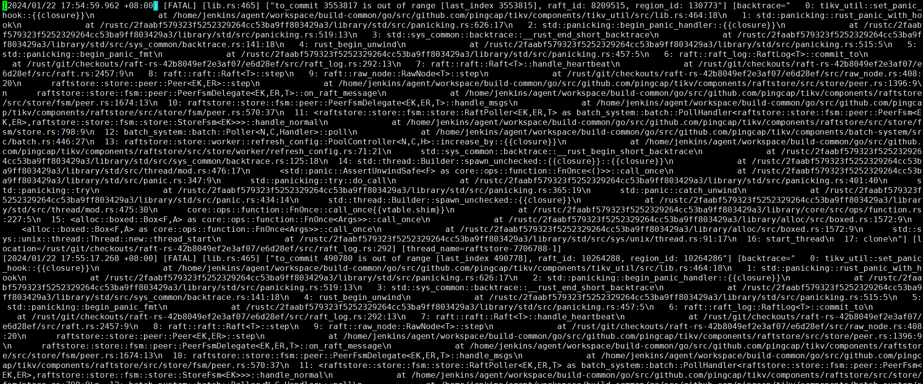 [2024/01/22 17:54:59.962 +08:00] [FATAL] [lib.rs:465] [“to_commit 3553817 is out of range [last_index 3553815], raft_id: 8209515, region_id: 130773”] [backtrace=" 0: tikv_util::set_panic_hook::{{closure}}\n at /home/jenkins/agent/workspace/build-common/go/src/github.com/pingcap/tikv/components/tikv_util/src/lib.rs:464:18\n