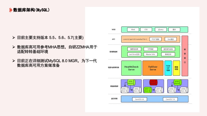 数据库架构层面,MySQL 目前主要支持的版本有5.5 、5.6、 5.7,以 5.7 为主;数据库高可用参考 MHA 思想,自研 ZZMHA 用于适配转转基础环境。