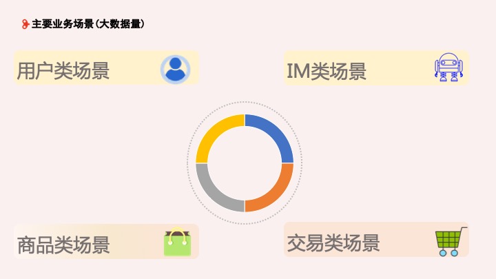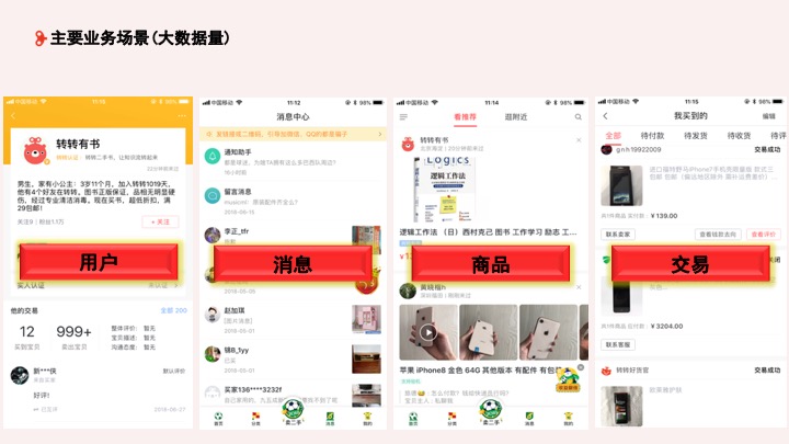 TiDB 在转转应用地范围广,我们也是基于上述哲学来指导选型的。转转是一个标准的电商,主要场景有:用户类场景、IM 类场景(这是转转切 TiDB 的第一个场景,也是电商的核心场景)、商品类场景和交易类场景。这些场景的特点是数据量大,对于传统的关系型数据库 MySQL 来说面临分库分表的问题,所以这些场景都由分布式关系型数据库 TiDB 支撑。