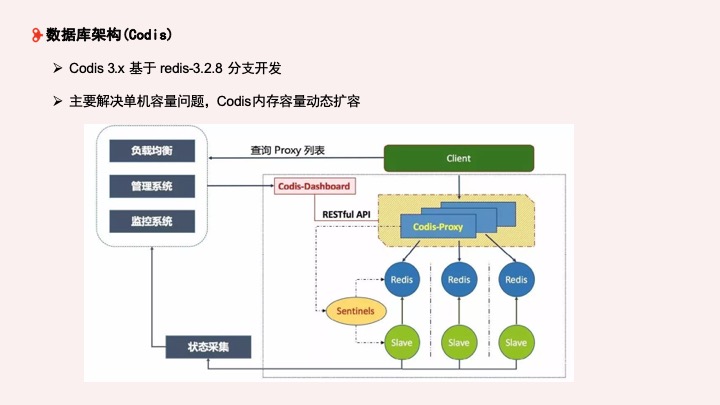 Codis 在原来的基础上做了一些外围治理工作,包括管理系统、监控系统及负载均衡系统。3.X 基于 Redis-3.2.8 分支开发,主要解决单机容量问题,Codis 内存容量动态扩容。
