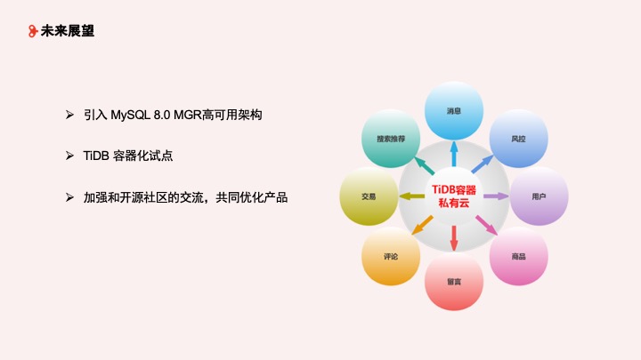对于未来,转转有以下几点展望 :将引入 MySQL 8.0 MGR 高可用架构;TiDB 容器化试点,把节点跑到云上; 加强和开源社区交流,共同优化产品。